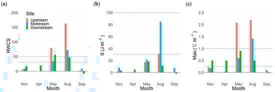 We identified thermal stratification events exceeding the threshold values as follows: the higher thresholds of RWCS and Max (RWCS = 50, Max = 1 °C m) coincidently suggested that the upstream stratified in May and August, but the midstream stratified in August only. The lower threshold of S (S = 30 J m−2) suggests that the upstream and midstream regions were stratified in August. Strong stratification upstream and midstream in August was further investigated diurnally to determine whether it would decrease below the thresholds.