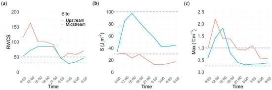 Diel variations in three stratification indices of two stratified sites in August ((a) RWCS, (b) S, and (c) Max, dashed lines: high and low thresholds for each index).