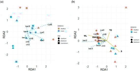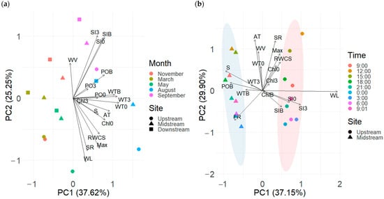 In the diel PCA, the upstream and midstream were clearly separated along PC1, associated with S, WL, WT3,B, POB, SI0,3,B, and ChlB, and these variables were highly site-dependent (Figure 5b). Each site had a diel cycle driven by PC2, associated positively with Max, RWCS, SR, WV, AT, WT0, and Chl0,3, and negatively with FR. In particular, Chl0,3 was positively correlated with RWCS and negatively correlated with FR. S, AT, Max, WL, FR, and SI3 were selected for the RDA.