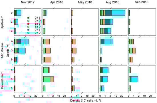 The phytoplankton community exhibited a seasonal shift at the phylum level (Figure 6). Massive cyanobacterial blooms were observed in November, August, and September, with high cell densities concentrated in surface waters. The blooming cyanobacterial genera varied by season, with Microcystis for August, the strongest stratification period, and Aphanizomenon for November and September, when the water bodies mixed well, and their proliferation was independent of stratification (Table S2). In May, Bacillariophytes dominated, and in April and September, co-domination of Bacillariophytes and Chlorophytes was detected. Unlike cyanobacteria, the cell densities of Bacillariophytes and Chlorophytes exhibited less vertical variation. For all the phytoplankton phyla, cell densities were not significantly different among the three water depths (0 m, 3 m, and bottom) (Kruskal–Wallis test, p ≥ 0.05, n = 15). However, the diel survey in August showed that all the phyla showed significant differences in cell density among water depths (Kruskal–Wallis test, p < 0.05, n = 18) (Table S3). Dunn post hoc tests revealed the water depths with significantly higher cell densities for each phylum: Cya0, Cya3, BacB, and ChlB (p < 0.05, n = 18).