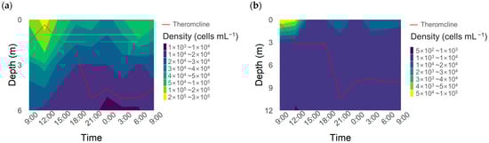 During summer, M. wesenbergii dominated all the study sites (Figure 6 and Table S3). However, their surface (0.5 m depth) cell densities and relative abundance at the surface layer were much higher in the stratified upstream (22.55 × 104 cells mL−1, 83.6%) and midstream (5.44 × 104 cells mL−1, 95.2%), coinciding with the spatial variation of stratification. In the relatively mixed downstream, the species showed lower density (1.02 × 104 cells mL−1) and surface accumulation (50.6%). An identical vertical distribution pattern was observed for the subdominant cyanobacterial species, M. aeruginosa and Microcystis sp. For comparison with the genus, in August, five species of Bacillariophytes and Chlorophytes were simultaneously detected at the three vertical water depths in both stratified and unstratified sites. They showed much less vertical variation in their cell densities in both stratified and unstratified sites, with low relative standard deviations (0.216 ± 0.082; n = 5). In addition, they were not concentrated in the surface water (1985 ± 539 cells mL−1, 38.2 ± 2.8%; n = 5). We further explored the effect of diel stratification on the cyanobacterial distribution. When strong thermoclines (>1 °C m−1) developed in the water columns (Figure 4), cyanobacterial densities at both stratified sites showed their maximum in the surface waters and minimum in the bottom waters (Figure 7). Upstream, a shallow thermocline floated from 1–2 m depth to the water surface, and then the cell density became concentrated in the upper water from 9:00 to 12:00. The high surface cell density decreased rapidly as the thermocline deepened. In the midstream, a shallow thermocline developed at 9:00, earlier than in the upstream, and the cell density showed its maximum value, followed by a decrease.