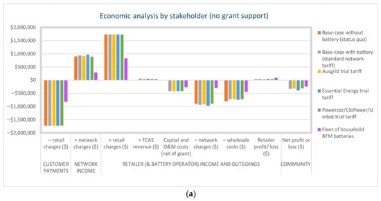 Figure 5 illustrates the stakeholder analysis for the FTM battery without any grants. The base case without a battery yields a total net profit or loss of AUD 0, confirming that the community does not generate additional income or losses in the absence of a battery.