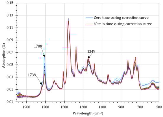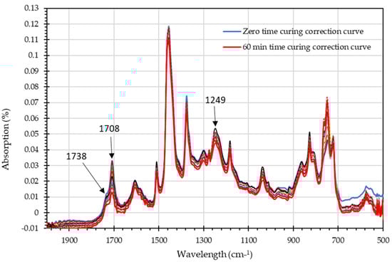 - A1249CURE = area of absorbance peak at 1249 cm−1 using a BL drawn from 1203 to 1275 cm−1.