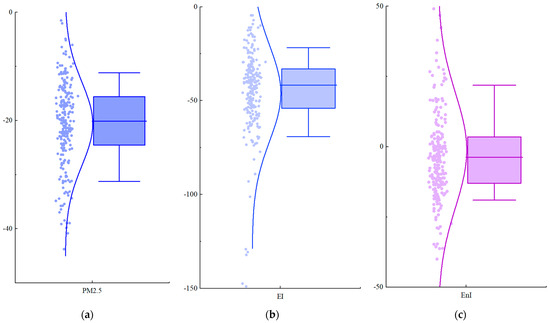 Scatter plot and box chart of the average annual PM2.5, EI, EnI, EO, and P from 2011 to 2020 of the 236 individual cities. The dots denote the minimum/maximum values, the horizontal bars in the box denote the median values, and the top and bottom edges of the box denote the 75th percentile and 25th percentile, respectively. (a) Scatter plot and box chart of the average annual PM2.5; (b) scatter plot and box chart of the average annual EI; (c) scatter plot and box chart of the average annual EnI; (d) scatter plot and box chart of the average annual EO and (e) scatter plot and box chart of the average annual P.