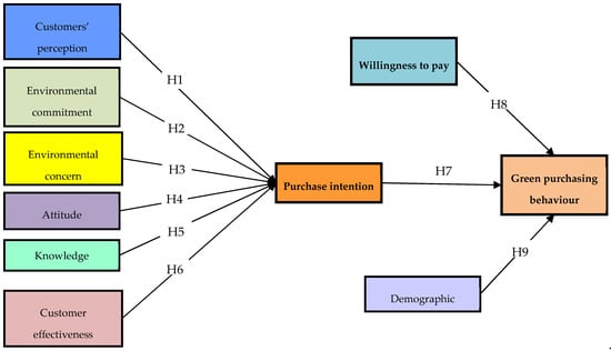Overall, previous research (Al Mamun et al. [50]; Cerri et al. [51]) established the linkage between customers’ environmental commitment and the intention to procure eco-friendly products, which led to the formulation of research hypothesis 2.