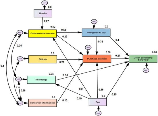 Overall, it is observed that when only the direct impacts are considered, four factors affect green purchasing behavior (willingness to pay, knowledge, purchase intention, and age), with the strongest being the willingness to pay (0.405). However, when indirect effects are also considered, environmental concern is also associated with green purchasing behavior (in fact, this factor has the third strongest total impact on green purchasing behavior).