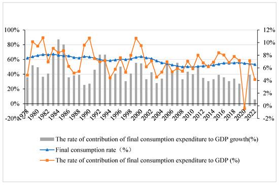 Consumption and GDP growth. Note: (1) source of data: the National Bureau of Statistics of China and http://www.stats.gov.cn/ (accessed on 1 January 2022). (2) The rate of contribution of the final consumption expenditure to GDP growth should be read using the right axis and the other two indicators using the left axis. (3) The rate of contribution of final consumption expenditure to GDP growth is calculated by multiplying the contribution of final consumption expenditure by the growth rate of GDP in the current period; the final consumption rate is the share of final consumption expenditure in the GDP obtained through the expenditure method; the rate of contribution of the final consumption expenditure to GDP is the ratio of incremental final consumption expenditure to incremental GDP using the expenditure approach.