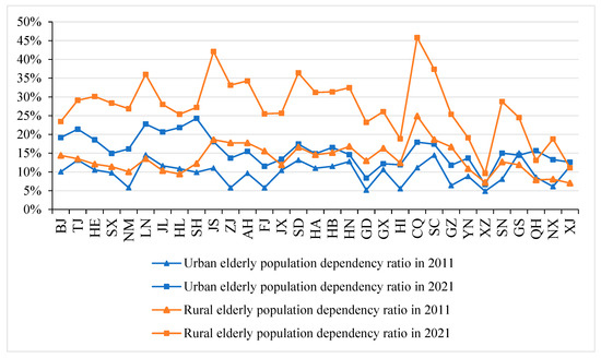 Dependency ratios of urban and rural elderly populations. Note: source of data: the China Statistical Yearbook of Population and Employment (2012–2022) and https://data.cnki.net/yearBook/single?id=N2023030104 (accessed on 1 January 2022); the China Statistical Yearbook (2012–2022) and https://data.cnki.net/yearBook/single?id=N2022110021 (accessed on 1 January 2022).