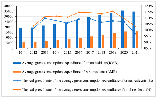 Average gross consumption expenditure rates of urban and rural residents and real growth rate. Note: (1) source of data: the National Bureau of Statistics of China and http://www.stats.gov.cn/ (accessed on 1 January 2022). (2) Average gross consumption expenditure levels of urban and rural residents are calculated on the basis of the average resident population and deflated by the consumption level index for urban and rural residents, respectively, with 2011 serving as the base period.
