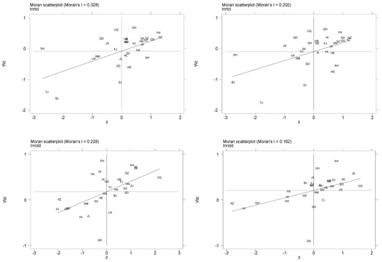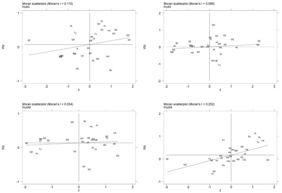 In order to determine the spatial characteristics of the distribution of the main variables of the 31 provinces, we referred to global Moran’s I proposed by Moran (1950) [64] based on the geographic inverse distance square matrix of the 31 provinces. The global Moran’s index takes the range of [−1, 1], with positive values indicating the existence of positive spatial correlations and negative values indicating the existence of negative spatial correlations.