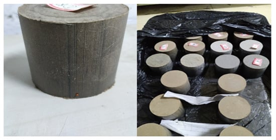 After drying, crushing, and removing impurities through a 2.36 mm sieve, the test soil was weighed and mixed evenly prior to being simmered for 12 h according to the above test scheme. The 50 × 50 mm specimen, formed by the static pressure method, should be numbered after desiccation. The quality and dimensions of the specimens were measured, respectively, with a balance with an accuracy of 0.01 g and a vernier caliper. The compactness of the actual formed specimen was then calculated. Typically, the compactness of the specimen after formation does not exceed ±1% of the standard compactness. The compactness of the specimens used in the test was 97%. The specimens were sealed with plastic film and stored in a climate-controlled box (temperature 20 ± 2 °C, humidity ≥ 95%) for 6 days. On the 7th day, the specimens were removed and filled with water at 20 °C for 24 h (Figure 2).