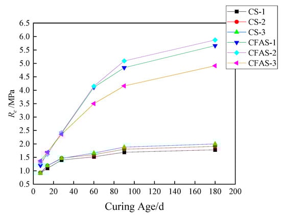 The differences in the unconfined compressive strength and splitting strength test results of CS and CFAS specimens at various ages (7, 14, 28, 60, 90, 180 d) were compared and examined. Figure 3 and Figure 4 display the test results.