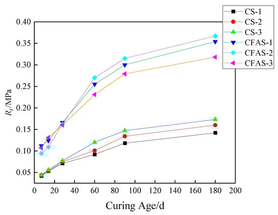Figure 3 and Figure 4 underline that with the increase in the age of the specimens, the unconfined compressive strength and splitting strength of CS and CFAS specimens increase. After adding fly ash, both strengths increased significantly. In contrast to the CS specimens, the unconfined compressive strength and splitting strength of CFAS specimens experienced a greater increase, and the gap between the two increased even more in the later stage, indicating that the addition of fly ash significantly enhanced the unconfined compressive strength of CCR-stabilized soil. In this case, at a rapid rate, the strength continued to increase along with the increase in age. This is due to the high contents of SiO2 and Al2O3 in fly ash causing a more intense volcanic ash reaction, and the C-S-H gel generated by the reaction effectively filled the distributed internal voids. This increased the stability of the soil particles, thus improving the strength of CCR-stabilized soil.