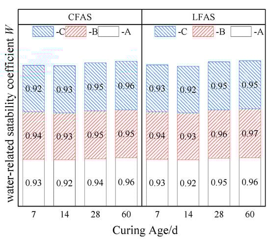 Water stability coefficients of CFAS and LFAS specimens at different curing ages (where A, B and C have the same significance as in Table 6).