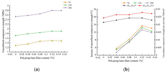 As depicted in Figure 6, the addition of PPFs could effectively improve the unconfined compressive strength of fiber–carbide-residue-stabilized soil. At 0.12% fiber content, the percentage of fibers increasing the unconfined compressive strength of the specimen reached the peak. Under the condition of 7% content of carbide residue, the unconfined compressive strength of fiber-stabilized soil specimens at 7, 14, and 28 d ages increased by 15.3, 15.0, and 14.9%, respectively, compared with that of un-doped fiber specimens. For the carbide-residue-stabilized soil specimens with 9% content, the percentages of fibers fortifying the strength of the specimen at 7, 14, and 28 d ages were 6.5, 11.2, and 11.0%, respectively.
