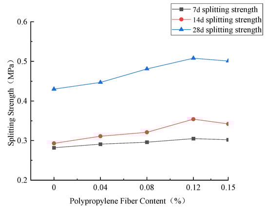 As exhibited by the test curve in Figure 7, adding PPFs also improved the splitting strength of stabilized soil specimens. The data chart emphasizes that when the PPF dosage was 0.12%, the splitting strength of CCR–fly-ash-stabilized soil specimens reached the peak, and its splitting strength at 7, 14, and 28 d was 1.08, 1.21, and 1.18 times that of CCR-stabilized soil without fiber addition, respectively. This case is similar to the change rule of the unconfined compressive strength of specimens after fiber addition. When the dosage of fibers exceeded the optimal dosage, the splitting strength of fiber–calcium carbide-residue-stabilized soil decreased accordingly.
