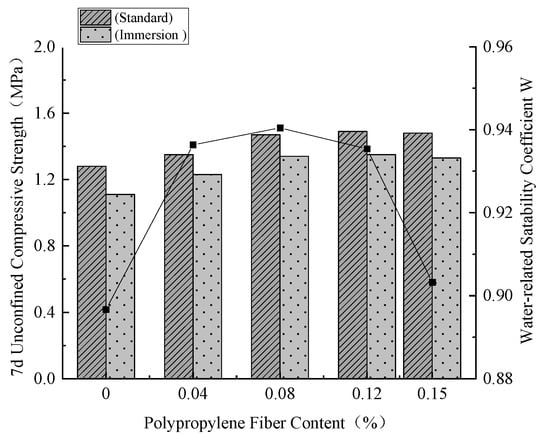 In this test, health-preserving 7 d specimens were selected as the research object, and the unconfined compressive strength of the 7 d specimens under standard health-preserving and immersed water-preserving conditions was assessed (Figure 9).