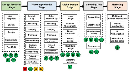 The course consisted of heterogeneous groups with 4–5 students per group, combining product design and media design students. The process of the ceramic creative product course practiced by the five groups is illustrated in Figure 1. The green circles represent the successful completion of the learning tasks, while the orange circles represent groups experiencing difficulties but open to teacher suggestions. Red circles represent groups that face challenges and are unwilling to modify their tasks. The course was divided into five stages, summarized below.