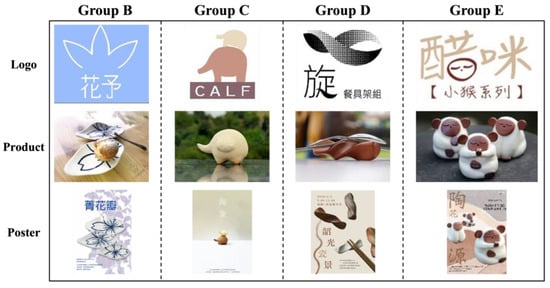 In the third stage (Figure 1), the students engaged in digital design, using various digital tools as differentiated scaffolding []. This included using digital photography, graphic and animation software, and digital editing software to design brands. Synergistic scaffolding was also employed, incorporating the development of marketing strategies, logo design to convey brand concepts, animated content to enhance brand image, and the creation of marketing posters and promotional materials. Figure 2 presents the results of the digital design phase for each group, featuring logo designs, product photography, and marketing posters.