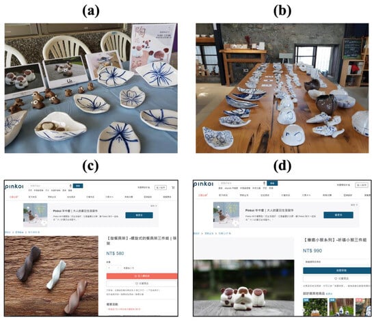 In the fourth stage, the marketing test, students engaged in activities such as photography and copywriting to compete in selling their products on the e-commerce platform “Pinkoi Design Gallery”. This stage allowed students to enhance their graphic integration skills. Group E also documented their learning process using microfilm to effectively convey the complete design concept of cultural and creative product development. Following a successful Creative Fair (Figure 3a,b), the industry-academic partner, 3S4S, recognized the Spinning Tableware Holder (Group D) and the Funny Monkey (Group E) as the best products. These products were made available for sale at the Pinkoi Design Gallery (Figure 3c,d). The limited production of the Funny Monkey (Group E) quickly gained popularity among regular 3S4S customers, resulting in a sold-out status shortly after its launch. In particular, the participation of the 3S4S manager served as a form of redundant scaffolding [,] in supporting and guiding students during the marketing stage. Significantly, participation effectively strengthened and improved the market value of the product. Furthermore, the 3S4S manager played a crucial role in transferring innovative knowledge and fostering the growth of new creative industries within the triple-helix model [].