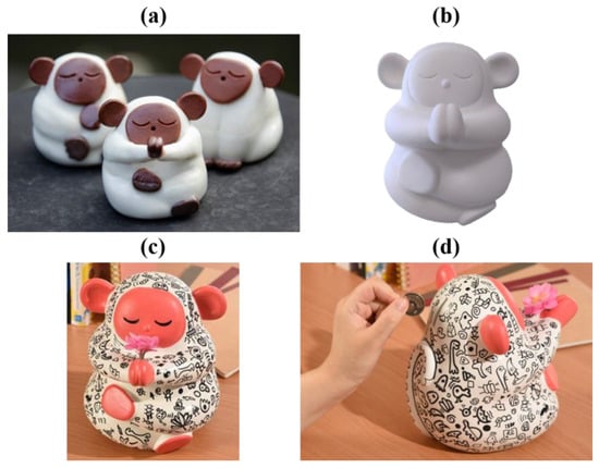 Funny monkey ceramic creative products. (a) prototype, (b) figure mold, (c) painted figure, (d) figure money box.