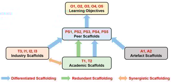 Differentiated scaffolding supports different learning goals with different characteristics. For example, software scaffolds are suitable to support highly repetitive training activities, and teacher scaffolds play a pivotal role in evaluating the learning process. Redundant scaffolding supports the same learning goals with different types of scaffolds for different learners, and well-prepared redundant scaffolding can effectively reach a more comprehensive range of learners with different ZPDs. Synergistic scaffolding consists of multiple co-occurring and interacting scaffolds supporting the same need. In a collaborative industry–academia project, the supporting scaffolds of disciplinary knowledge provided by school education and the supporting scaffolds of practical expertise from industry are linked through a synergistic strategy to achieve a common goal [,].