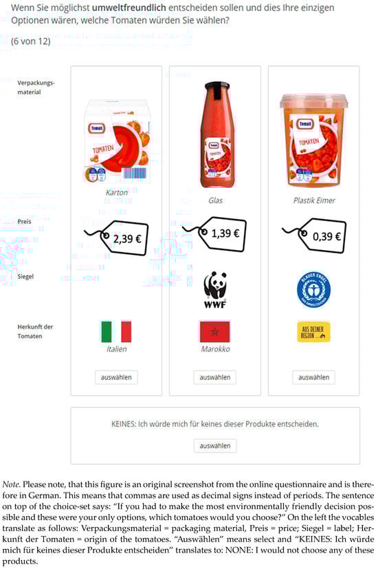 A choice experiment was used in this study to investigate consumers’ choice behavior and their preferences for different food product characteristics. For this purpose, different choice sets were created by randomization using Sawtooth Software (version 9.13.0). By selectively varying the product features, their influence on choice-decisions can be determined. The aim of the experiment was to evaluate the importance of individual product attributes on the respondent’s choice behavior and whether these parameters vary between respondent groups to derive information on demand and acceptance. Even though it is not a real purchase situation, the results are assumed to show a high degree of correspondence between the hypothetical and the real decision, even for strongly socially desirable behaviors such as choosing sustainable products [14].