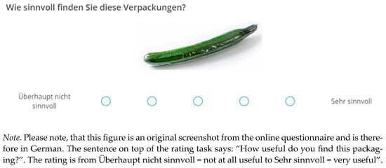 The examples used were taken from a study by Denkstatt GmbH [25], in which the change in food waste after packaging changeover was investigated. The respondents were asked to rate the six examples on a scale from 1 (not at all useful) to 5 (very useful). The aim of this evaluation is to analyze whether the participants perceive the benefits of optimized packaging. In addition, the acceptance of packaging can be investigated when unpackaged options are available, and, in contrast to the products in the choice-experiment, fresh food is involved. Figure 2 shows an example from the package usefulness rating.