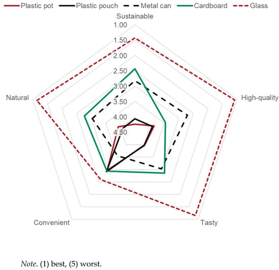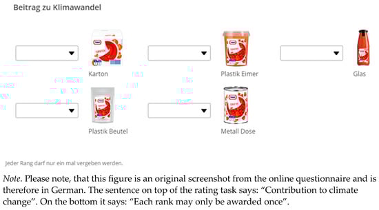 In the fourth part of the questionnaire, participants were asked to rank the packages of metal cans, glass bottles, cardboard containers, plastic pouches, and plastic pots in terms of various characteristics and environmental categories from 1 (best) to 5 (worst). Each rank could only be used once. The attributes in the first part of the ranking were sustainable, high quality, tasty, and convenient. These were taken from a study by Steenis et al. [9] that examined the role of packaging material in sustainability ratings in the Netherlands. The aim was to gain an impression of the image that the materials have among the participants and draw possible conclusions from this about the choice-behavior in the experiment.