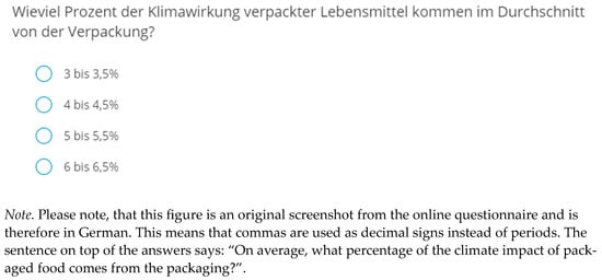 When conducting the survey, participants were asked to answer five questions, each with four possible answers. All questions involved estimating numerical values related to the climate footprint, climate impact, or environmental benefit of packaging, and one point was awarded for each correct answer. The answer choices were coded from one to four. For each question, the first choice was right and reflected the lowest impact. As the number of options increased, the negative impacts of packaging in the answer option also increased numerically. Because of that, the evaluation could also measure whether the respondents overestimate the climatic impact of packaging by analyzing the average response number. Figure 4 shows an example of a question from the quiz.
