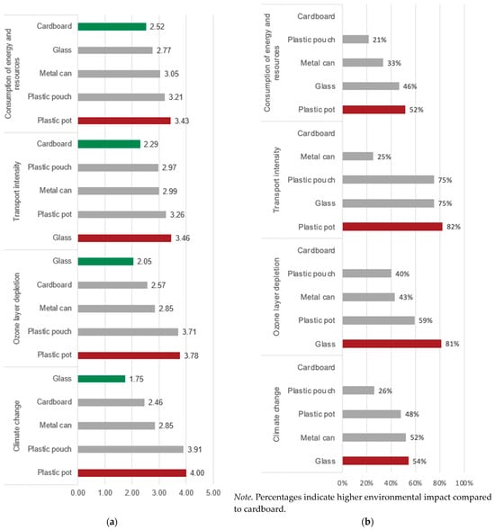 The environmental categories, contribution to climate change, ozone layer depletion, and transport intensity in the second part of the ranking originate from the life cycle assessment (LCA) for the packaging of long-life foods [18]. Various resource-relevant categories (consumption of abiotic resources, fossil resources, and primary energy, renewable and non-renewable) were combined as ‘consumption of energy and resources’ and were integrated into the ranking [18].