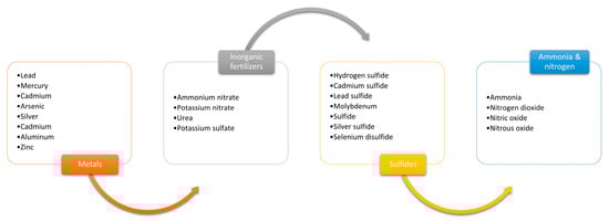 Heavy metals, nutrients, sediments, and industrial waste are examples of inorganic pollutants. The increase in anthropogenic activities and the set-up of industries related to mining, agriculture, etc., has increased the emergence of these environmental contaminants. These environmental contaminants are present in different water bodies [18,19,20,21,22]. These contaminants are responsible for cancer and other microbial diseases due to properties such as bioaccumulation and non-biodegradability of these pollutants have been developed, which demonstrate a continuous rise in their concentration [23,24,25].
