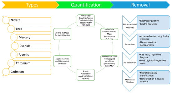 Inorganic pollutants are often made up of inorganic byproducts that result from radiant radiation, noise, heat, or light. In general, inorganic contaminants include arsenic, cadmium, lead, mercury, chromium, aluminum, nitrates, nitrites, and fluorides. Most of them possess an extended tenacity and resistance to deterioration [26,27,28,29]. The primary components of inorganic pollutants are connected to operations like mining and the burning of fossil fuels, municipal solid waste, industrial waste, and fertilizers. There are various types of inorganic pollutants in water that are responsible for various diseases and other comorbidities. Figure 2 presents a schematic presentation of inorganic pollutant types, their quantification methods, and their removal technologies.