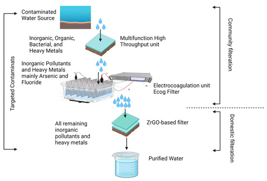 Water is a fundamental and essential requirement for the survival of living beings. The health of people and aquatic ecology are both seriously threatened by pollutants in water bodies. There are several types of water pollutants, including pathogens, thermal pollution, radioactive pollution, inorganic pollutants, and organic pollutants [1]. Fresh water is a common drinking-water source in both rural and urban areas, including India (95% of Indians reside in rural regions, and 30–40% live in urban areas). Recent statistics show that more than 1.2 billion people globally lack access to safe drinking water, which is essential for survival [2]. Intensive industrialization and reckless farming practices in recent decades have increased the number of harmful contaminants in groundwater, including inorganic chemicals, heavy metals, radioactive bacteria, and synthetic organic reactants [3]. Arsenic, fluoride, iron, nitrate, heavy metals, and other inorganic pollutants are frequently present in water, and their prevalence in quantities over acceptable limits reduces the water’s suitability for living creatures. Pollutants like arsenic, fluoride, and iron are among the pollutants that have a geological origin, whereas other pollutants like nitrates, phosphates, and heavy metals are anthropogenically introduced by factors such as inadequate sewage systems, poorly managed agricultural practices, and industrial discharges. The main factors affecting the degradation of groundwater quality are strong industrial expansion, urban growth, and enormous population increases [4].