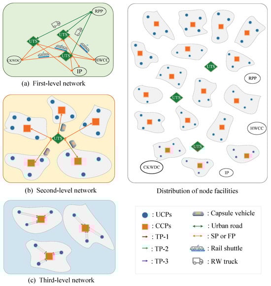 According to the facility capacity, transport vehicle load, and waste type, the main transportation technology systems used in this paper are selected from Table 1. For the TPs, due to the shorter transportation distance of the third-level network, it can be transported at any time. It is easy to use pneumatic pipelines. For FPs and SPs, the PCP or UCT vehicle mode can better meet transportation needs. It can also be selected according to local needs.