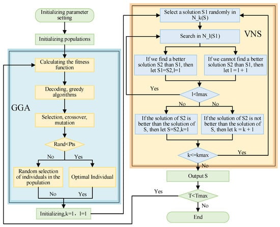 GA is an adaptive search algorithm based on natural selection and evolutionary theory. When the possible space is small, GA can easily obtain an accurate solution. However, it is difficult to achieve global optimization []. The greedy algorithm is always the best choice to make when solving a problem. But its solution is fast and efficient. The VNS algorithm is a meta-heuristic method based on the idea of changing neighborhoods, as proposed by Mladenovic and Hansen []. The basic idea is to systematically change the neighbor structure of multiple search solutions in the local search process to make the search space deeper and more extensive and to prevent falling into the local optimum while ensuring the quality of the optimal solution []. Therefore, in this paper, a hybrid genetic greedy algorithm-genetic variable neighborhood algorithm (GGA-GVNS) optimization approach is designed to solve the specificity of the solution problem. The flowchart is shown in Figure 2.