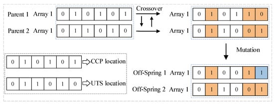 The chromosome coding uses 0-1 encoding, and the location decision of CCPs and UTSs is encoded into two 0-1 arrays, and 1 indicates that the node is selected. The initial values use random individuals and calculate the initial fitness value based on the fitness function. Equation (21) indicates the fitness function. The related genetic operations are described in detail in Section 5.2.2, where the GGA genetic operations are shown in Figure 3.