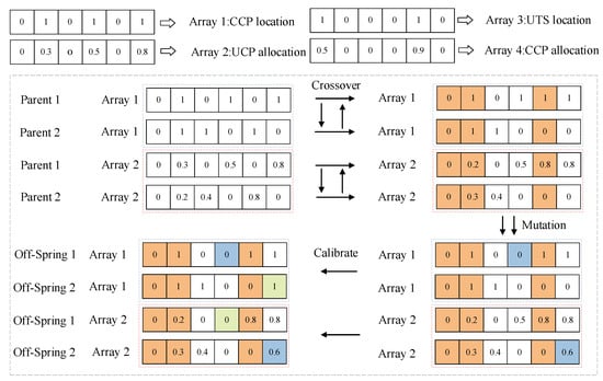 The chromosome coding is encoded in two ways: 0-1 coding and real digital coding. There are four arrays in an individual. The location of CCPs and UTSs is encoded in two 0-1 arrays. The distribution from UCPs to CCPs and CCPs to UTSs uses real digital coding, and the real number is [0, 1]. In the previous array, 1 indicates that the node is selected. In the latter array, take the allocation of UCPs and CCPs as an example. There are four CCPs satisfying the condition after specific constraints of UCP nodes; at this time, 1 is divided into four equal parts, and if the chromosome value is 0.3, then the second one is selected as the final UCPs allocation node among the CCPs already satisfying the condition.