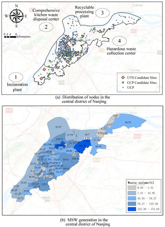 In summary of existing studies, we find that scholarly investigations into the subterranean collection of MSW have been scarce, primarily focused on evaluating the feasibility and benefits of underground automatic vacuum collection systems [,,]. With the advancing strides in intelligent technology and the initial implementation observed in select new cities, UWCS represents an emerging solution to cope with the ever-growing MSW production. Next, most researchers have concentrated on the study of small-scale MSW collecting systems within cities. Instead, there is very little research on the design and network planning of large-scale underground MSW collection systems. Furthermore, network planning can be made more efficient and decision-making easier through the use of mixed-integer planning models to quantify the network layout of large-scale urban domestic garbage collection systems. To fill the gap, this study proposes a network design method for a large-scale automated waste collection system as a case study in the central city of Nanjing, China. Firstly, we provide an overview of the various technical techniques and create the entire suite of UWCS operational processes. Secondly, a mixed-integer linear programming (MILP) model and solution algorithm are introduced to obtain the location of node facilities and the waste distribution between the facilities. Furthermore, a sensitivity analysis is conducted to examine the model’s viability across various parameters. By providing an efficient underground waste collection system for Nanjing, this study’s findings will facilitate rational decision-making by local authorities concerning the management of MSW.