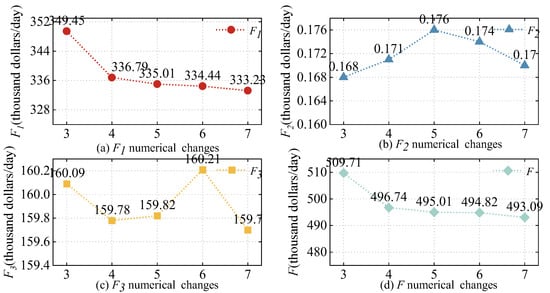The objective function F of the MILP model is to minimize the total cost of the UWCS, which mainly includes three parts. The first part of Equation (4) is the construction cost of CCPs, UTSs, TPs, SPs, and FPs. The second part is the procurement cost of CCP equipment. The third part is the total transportation cost, which combines (i) the transport cost of the SPs and the FPs, (ii) the road transport cost, and (iii) the disposal cost at CCPs.