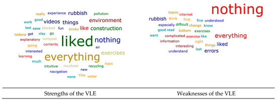 - Survey on perceived user satisfaction with the use of the VLE. An ad hoc questionnaire was designed, consisting of 12 closed-response items measured on a scale of 1 to 3 (ranging from 1 = not at all satisfied to 3 = very satisfied), and open-response questions addressing the strengths and weaknesses of the VLE (see Appendix A). The questionnaire obtained an α = 0.77 and Ω = 0.74 for the whole questionnaire, and an interval of α = 0.72- α = 0.78 and Ω = 0.67- Ω = 0.76 for the remaining elements.