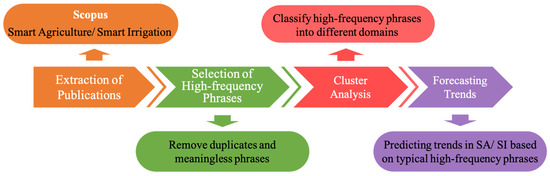 The remainder of this paper is organized as follows [30]. Section 2 presents the extraction method and results of publications related to the topic and defines clusters. Section 3 presents the analysis and results. It mainly analyzes the development trends of smart irrigation and smart agriculture and compares their high-frequency words and phrases, focusing on crops and the most common phrases. Section 4 discusses the differences and connections between different topics, future research trends of these two topics, and seven high-frequency phrases in smart agriculture and irrigation. Finally, Section 5 concludes this study and gives some limitations and future research directions.