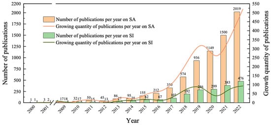 As a preliminary analysis, this article uses the annual quantity and the annual growth quantity of publications as indicators to evaluate research trends on smart agriculture and smart irrigation in this century. The annual growth quantity is used instead of the growth rate here because these topics are an entirely new concept, and using the growth quantity for analysis will make it clear to readers [29]. For example, the number of publications on smart agriculture increased from only one in 2000 to three in 2001, a growth rate of 200%, while the quantity increased by 351 articles from 2020 to 2021, a growth rate of only 31%. If growth rates are used to analyze this, the results can be seriously skewed from reality.