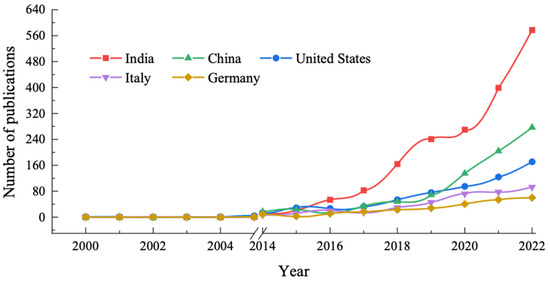 In addition to the number of publications, the country attributes of publications can also positively reflect the research trends of the topic [28]. An analog analysis was performed, considering the number of publications per country to characterize the geographic distribution of the research on smart agriculture and smart irrigation. Figure 3 shows the top five countries for the quantity of publications in 2000–2022.