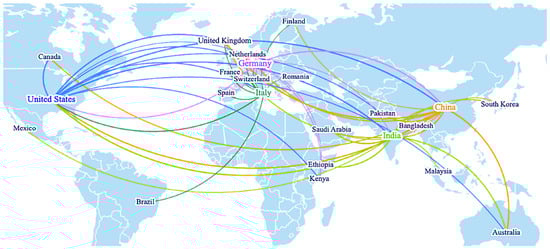 A more specific analysis of the geographical extent of the research focuses on collaborations among universities from different countries that aim to determine how the chosen topic can generate collaborations in the scientific community. Figure 4 shows in a graphic way how the web of collaborations for the smart agriculture topic is well distributed in the world among different countries.