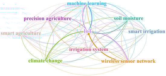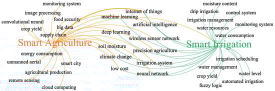 The present analysis sorted out common high-frequency phrases about smart agriculture and smart irrigation, conducted a comparative analysis and found that (Figure 5): (1) The same high-frequency phrases in both are IoT, climate change, machine learning, precision agriculture, wireless sensor network, soil moisture, deep learning, artificial intelligence, irrigation system, low cost, neural network. At the same time, most of these phrases use thicker colored lines (Figure 5), which show that these areas are highly concerned in SA and SI. (2) High-frequency phrases that do not include smart agriculture in smart irrigation are big data, food security, supply chain, agricultural production, smart city, cloud computing, and energy consumption. These research hotspots may be the next research direction of smart irrigation [10,26].