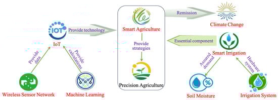 As an essential part of SA, smart irrigation (SI) has a more detailed focus, focusing on the relationship between agricultural water use and crop growth, including information on water quantity and quality, soil characteristics, weather conditions, and fertilizer use parameters [22]. The Food and Agriculture Organization of the United Nations (FAO) predicts that food production will increase by more than 50% by 2050, leading to a 10% increase in agricultural water demand [23]. SI can minimize water waste based on plants’ actual water and nutrient needs, which can alleviate the contradiction between the growing food needs of the growing population and agricultural water needs [24], while minimizing environmental impacts such as greenhouse gases and fuel consumption [25].