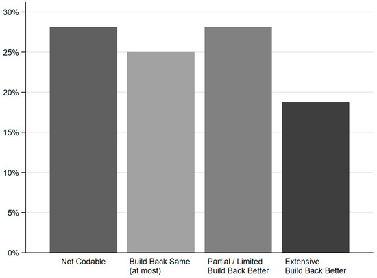 We analyzed the responses to gauge the extent to which participants indicated implementation of a “Build Back Better” approach in the reconstruction of homes for members of vulnerable populations in their respective areas. Figure 2 shows that approximately 1/4 of responses (25%) indicated that the focus of reconstruction efforts was to get disaster victims’ houses back to where they were, i.e., to merely “get that place habitable” or to get housing back to a place where it was “safe, sanitary and secure and addressing basic needs”. Slightly more respondents (28%) discussed reconstruction efforts that involved a limited application of Build Back Better ideas, often bounded by cost and feasibility constraints. Finally, approximately one in five respondents (19%) described recovery and reconstruction efforts that placed major emphasis on BBB. Slightly more than one quarter of respondents (28%) did not respond to the question on Build Back Better, or provided a response which could not be categorized.