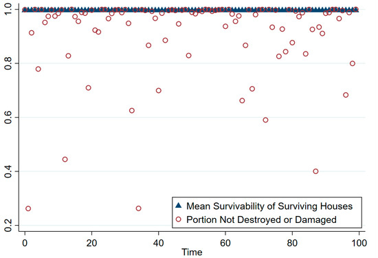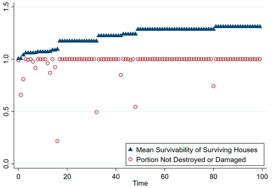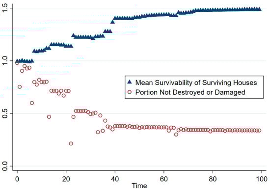 Scenario 3 adheres to the principles of “Build Back Better.” This approach focuses on reconstructing houses with the aim of ensuring they can resist disasters more effectively than before, resulting in a survivability increase of 0.2. Figure 5 provides a visual representation of a typical model run in this scenario. Early disasters in the run led to notable improvements in the mean survivability of the housing stock. By approximately period 20, very few houses were experiencing damage, and the average survivability of the housing stock had risen from its initial starting point of 1 to a level exceeding 1.2. When we analyze a thousand runs within this scenario, a compelling trend emerges. The average number of houses damaged per period consistently decreases, dropping from eight percent to merely one percent. This decline can be attributed to the enhanced survivability of houses, a direct outcome of the improvements enacted through the Build Back Better strategy. This approach demonstrates its effectiveness in safeguarding communities against disasters and minimizing the extent of damage sustained over time.