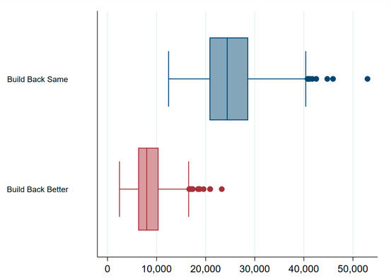 Hundred-period reconstruction cost: Build Back Better versus build back the same. Note: assumes no time discounting. The boxes represent the 25th to 75th percentile. Circles represent outliers.